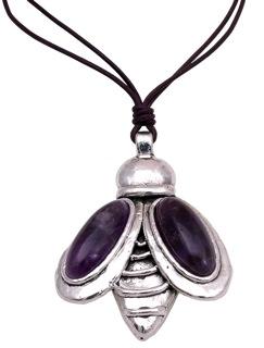 Acompañado de un collar de cuero, el colgante luce resina morada en las alas de la abeja.