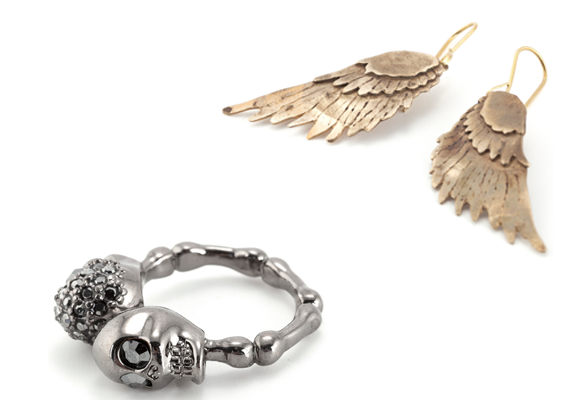 Alas y calaveras con piedras blancas y negras incrustadas, tanto en colgantes, pulseras, pendientes y anillos.