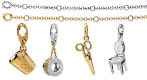 Pequeñas formas que recuerdan y sugieren la elegancia y la alta costura que siempre propone Dior, como el clásico dedal, tijeras de costurera, la simbólica silla Dior, las actuales calaveras, una rosa lacada en tonalidades rosa y verde, la palabra “oui” con un diamante incrustado, una placa de identidad grabada con el nombre de la firma, una bobina e incluso un charm en forma de pequeño joyero, que se puede abrir y cerrar, y que guarda un pequeño anillo con un diamante, que simboliza el compromiso.