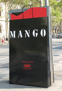 Grandes bolsas de compra anuncian las colecciones Mango y HE by Mango en las principales calles de Madrid y Barcelona.