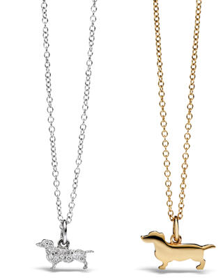 El perro salchicha se viste de oro blanco con empedrado de diamantes, y también en oro amarillo con brillantes.