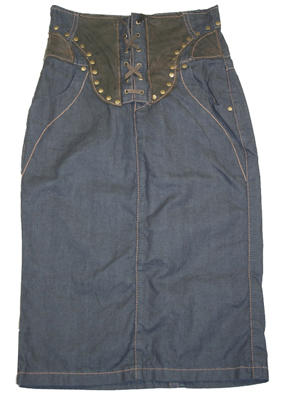 Falda recta de tiro alto con aplicaciones en cuero y remaches de tachuelas doradas, un estilo muy cow boy.