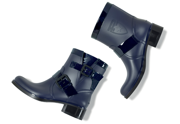 Botas realizadas a partir de neumáticos de caucho negro, que llevan correas de cuero y hebillas.