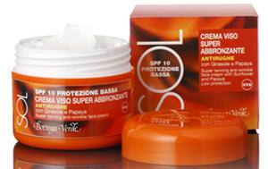 La crema facial superbronceadora antiarrugas, con girasol y papaya, es de protección SPF10 y elevado factor de protección filtra los rayos UVA y UVB. La loción postsolar lenitiva con helicriso y manzanilla remedia las consecuencias de la exposición prolongada, atenuando los enrojecimientos provocados por el sol, restituye el justo nivel de hidratación y ayuda a mantener el bronceado.