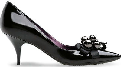 Elegante zapato escotado realizado en piel negra, con una pala muy abierta y decorado con un lazo negro con abalorios metálicos.