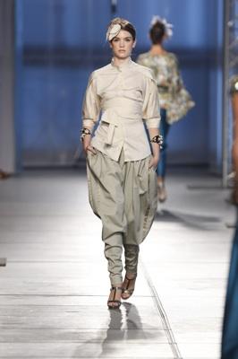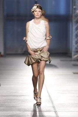 Faldas bombón con volúmenes en las caderas y entalladas en el bajo, que se combinan con gasas volátiles y ligeras.