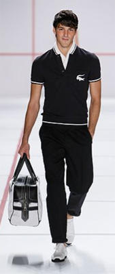 Christophe Lemaire, director creativo de la firma, ha actualizado la chaqueta americana que el fundador René Lacoste acostumbraba a vestir, así como el polo, que se presenta en varios colores contrastados. Para la mujer apuesta por el clásico blazer, un pulóver listado con rayas verticales y cuello en forma de uve, un chaleco de manga corta y capucha en punto suave y un vestido sin mangas en petit piqué con una banda de distinto color alrededor del cuello.