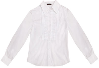 Preciosa camisa blanca de algodón de manga larga, cuello y puños camiseros, y como detalle pechera de pequeños pliegues.