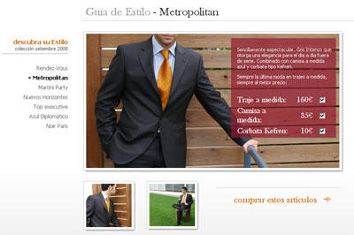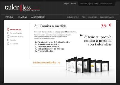 Se trata de una web en la que podrás comprar trajes y camisas realizados completamente a medida. Puedes escoger el tejido en el que se confeccionará tu prenda, introducir tus medidas paso por paso, y detallar exactamente el tipo de hechura que deseas, para una camisa o traje más clásico o moderno.