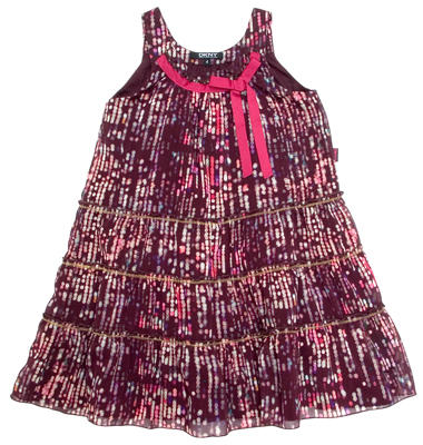 Vestido de tirantes en color morado, estampado con pequeños topos en tonos rosas y malvas, con volantes en la parte inferior y un lazo en el cuello.