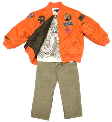 Para  niño, pantalón beige con camiseta blanca de algodón con estampado en verde, y cazadora naranja con cremallera y parches de estilo aviador.