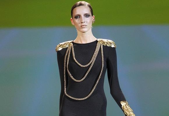 ¿Qué tal unas hombreras doradas con cadenas sobre la pechera al más puro estilo Bee Gees o Michael Jackson? Aristocrazy las tiene y se han visto en la pasarela en Madrid…