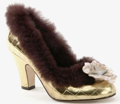 Zapatos muy atrevidos en tonos dorados, telas estampadas en capitoné, encajes y lazos de charol en salones peep toe.