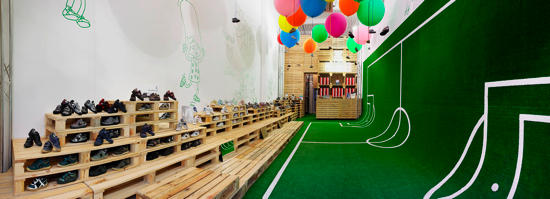 El nuevo espacio se inspira en el mundo del fútbol para crear un divertido universo donde los zapatos son los protagonistas.