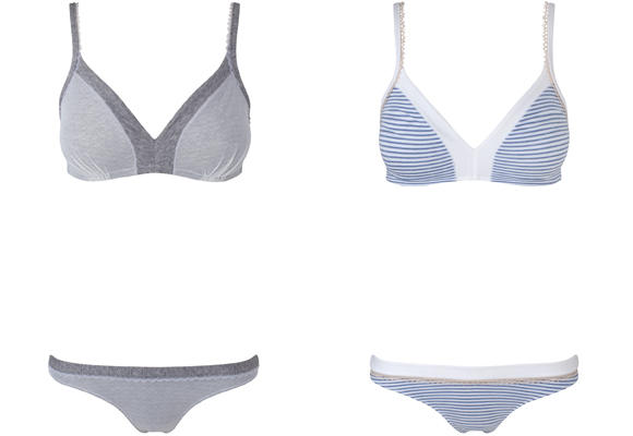 Líneas sencillas con cierto toque de elegancia. Sujetadores realizados en algodón de lycra en raya tejida, decoradas con puntillas de fantasía, en tonos pálidos y suaves.