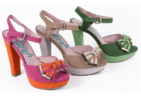 Los colores ácidos y flúor aparecen en varios modelos, como los salones peep toe en combinaciones bicolor.