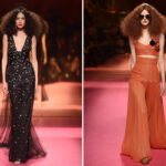 La paleta de colores se pasa en el azul, rojo, blanco, negro o naranja que aparecen también en estampados gráficos o materiales con efecto espejo.