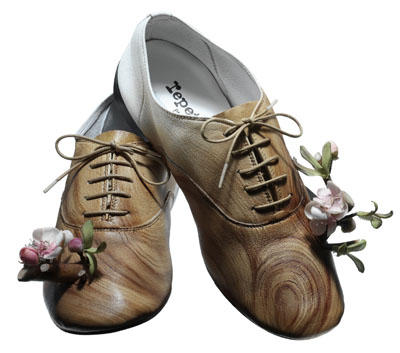 Los zapatos Zizi se inspiran en el concepto surrealista del cuero convertido en madera. El detalle es una flor de algodón de color melocotón y una hoja de seda reforzada con lona que se datan en los años 50.